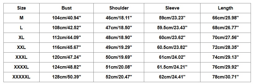 Sizes: M, L, XL, 2XL, 3XL, 4XL, 5XL